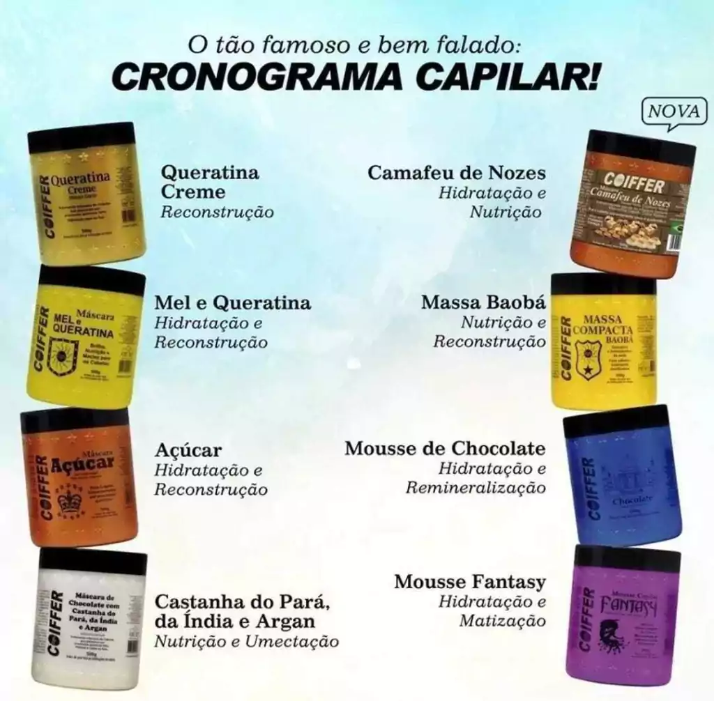 O cronograma capilar é uma rotina de cuidados com os cabelos que intercala três tratamentos principais: hidratação, nutrição e reconstrução. Cada etapa do cronograma capilar oferece uma solução específica para cabelos danificados por fatores como poluição, incidência de raios solares, cloro da água, uso excessivo de ferramentas de calor, procedimentos químicos de coloração ou descoloração, entre outros.