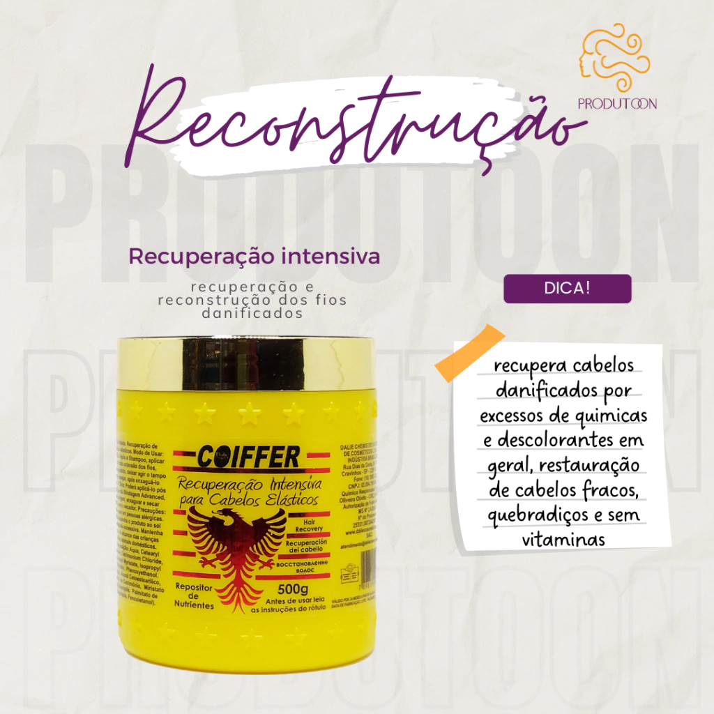 A Recuperação intensiva coiffer recupera cabelos danificados por excessos de descolorantes e quimicas em geral. Seu maior beneficio é a restauração de cabelos fracos, quebradiços e sem vitaminas.