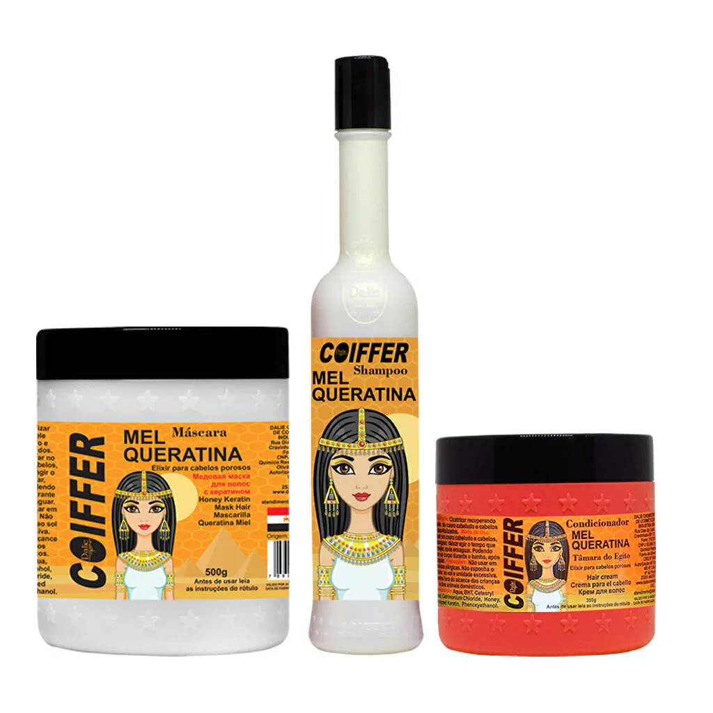A Kit Mel Queratina Premium Coiffer faz a regeneração e cicatrização da pele do couro cabeludo e dos fios, auxilia nos cabelos desvitalizado, é um cicatrizante do couro cabeludo e pele, antisséptico e antioxidante. Possui em sua composição Tâmara do Egito que fornece nutrição para raiz do cabelo, proporcionando cabelos mais fortes, sedosos e brilhantes.